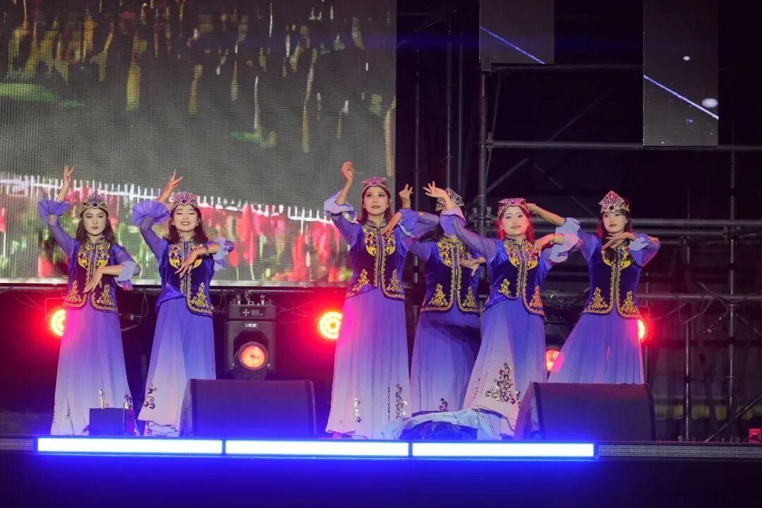 本场双庆晚会以“红韵迎国庆·青春接新程”为核心,用艺术笔墨书写家国与边疆的共荣篇章。红色舞蹈舒展如山河,勾勒祖国76载壮阔征程;维吾尔族歌舞灵动似繁花,展现新疆70年发展活力。